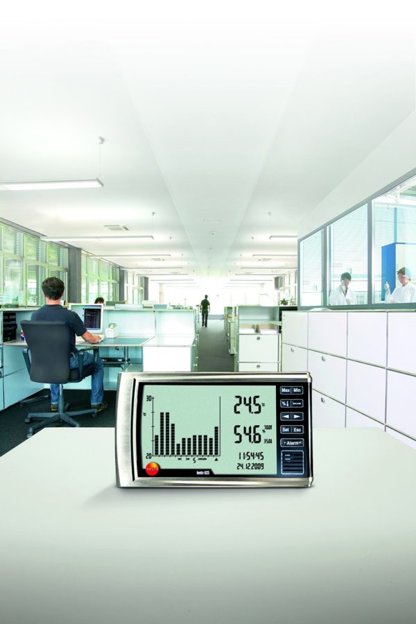Testo 623 thermo hygrometer er utviklet for å overvåke innetemperatur og luftfuktighet nøyaktig og pålitelig. Brukerdefinerte innstillinger lar deg bestemme lengden på intervallene mellom målingene – fra 5 minutter til 24 timer. Målingene lagres automatisk i løpet av en periode på 90 dager, og en alarm varsler rommets brukere når en terskel er nådd.