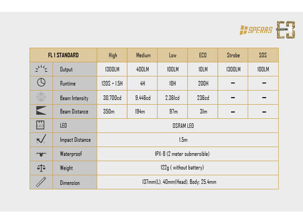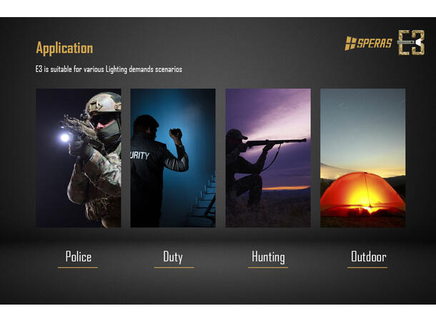Speras Lightning Co., Ltd er produsent av premium lysprodukter med en utviklingsavdeling som sørger for at brukere over hele verden får de beste produktene. Produktene er utviklet med bruksområder både innen militær, politi, sikkerhet, redningsarbeid samt jakt, friluftsliv og daglig bruk.